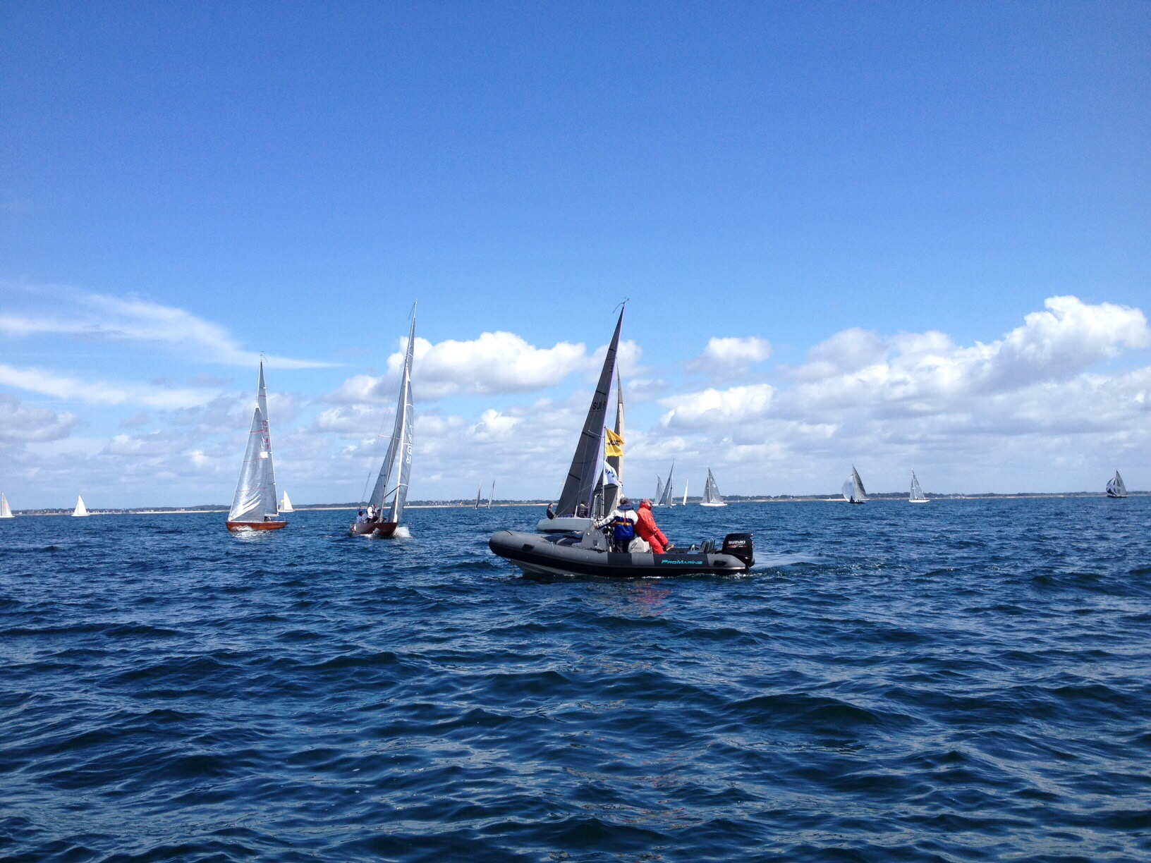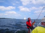 Mittwoch: Drei Wettfahrten sind geplant und es geht pünktlich raus. Die Wettfahrtleitung will die leichte Briese nutzen. Der erste Startversuch wird abgebrochen und wir warten. Als sich die Sonne wieder durchsetzt kommt auch der Wind.