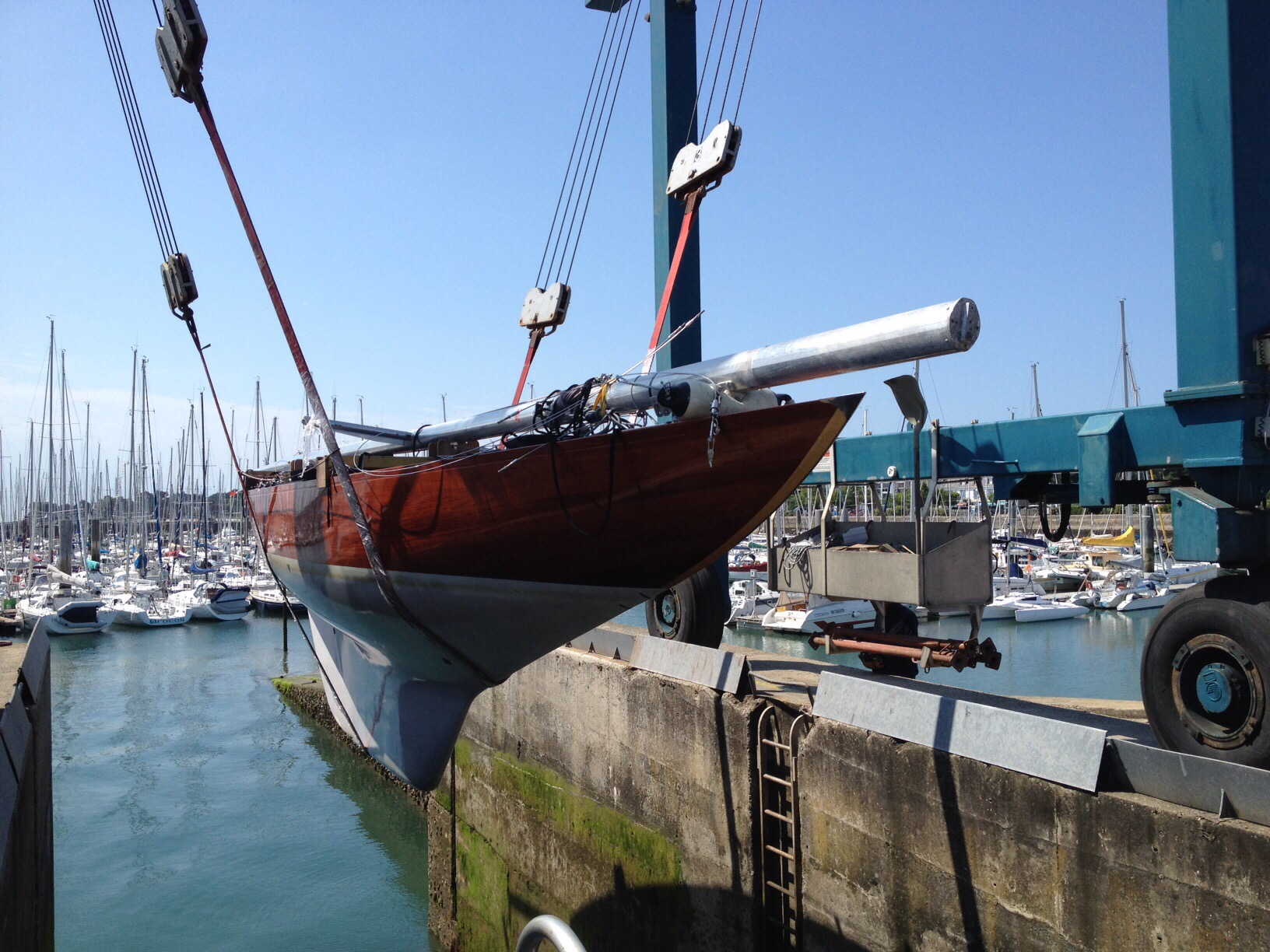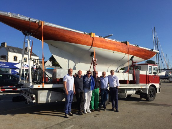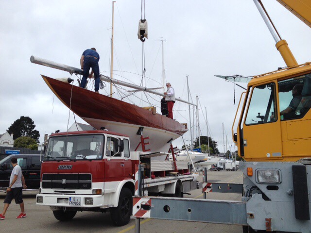 Kaum angekommen mit dem eigenen LKW – Danke an unseren tapferen Fahrer Thomas – in La Trinite sur Mer, Bretagne, wird schon der Mast gesetzt.